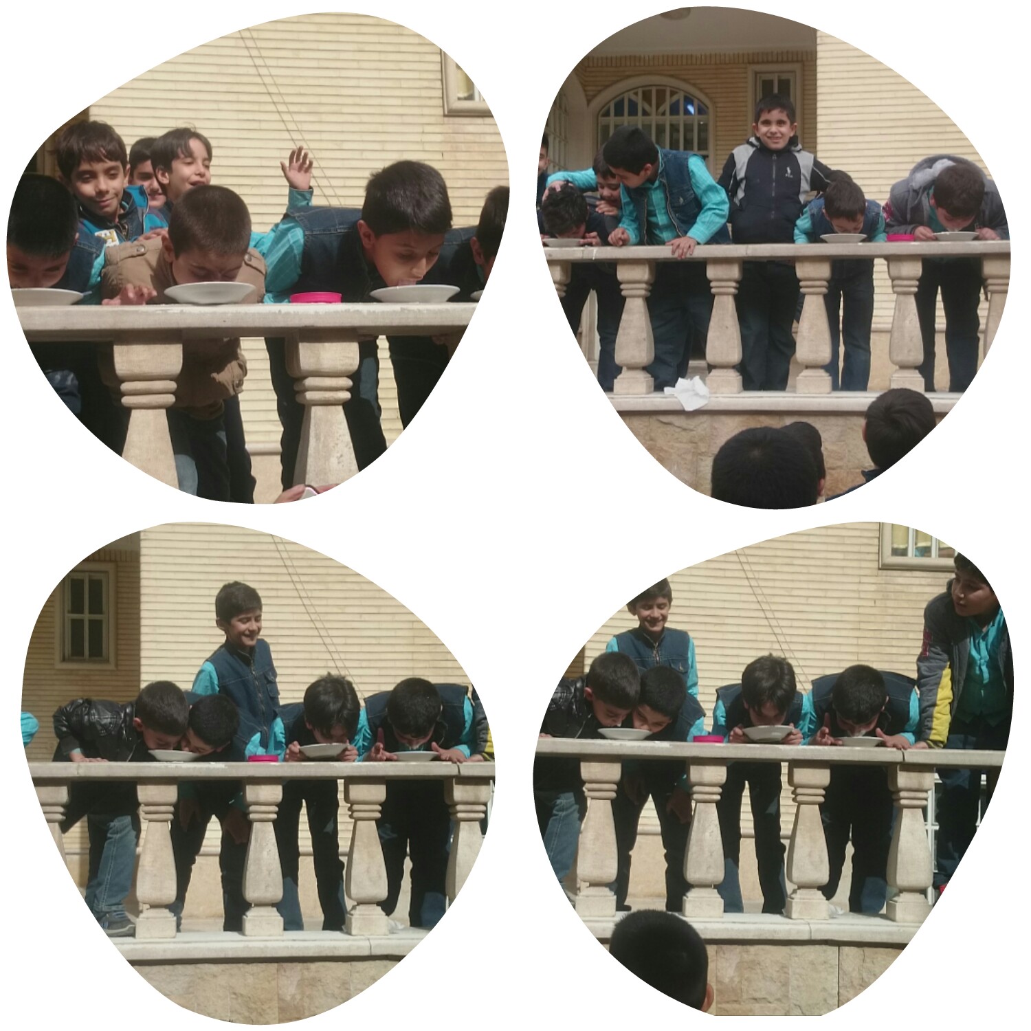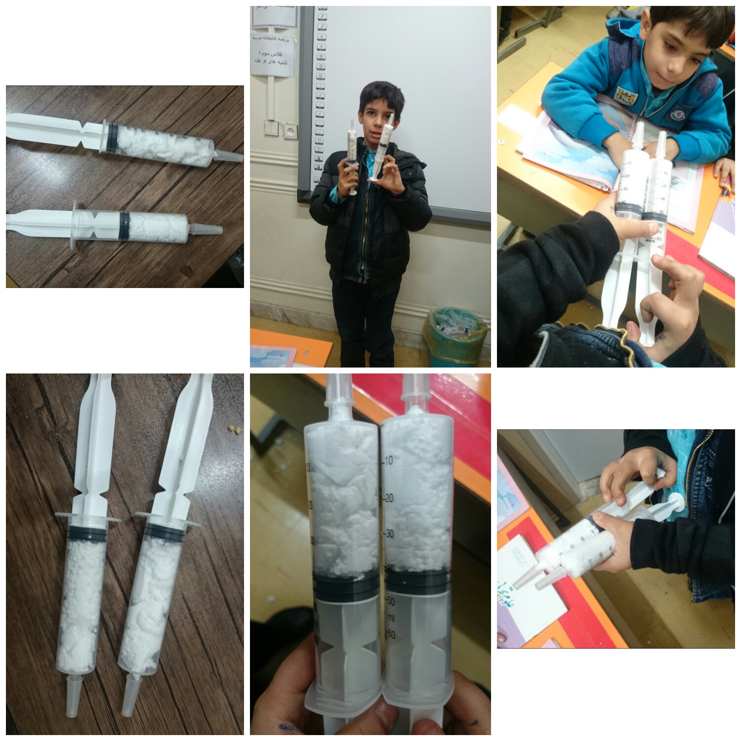 بچه ها با فشار دادن سرنگ ها تلاش می کنند حجم آن ها را مساوی کنند.